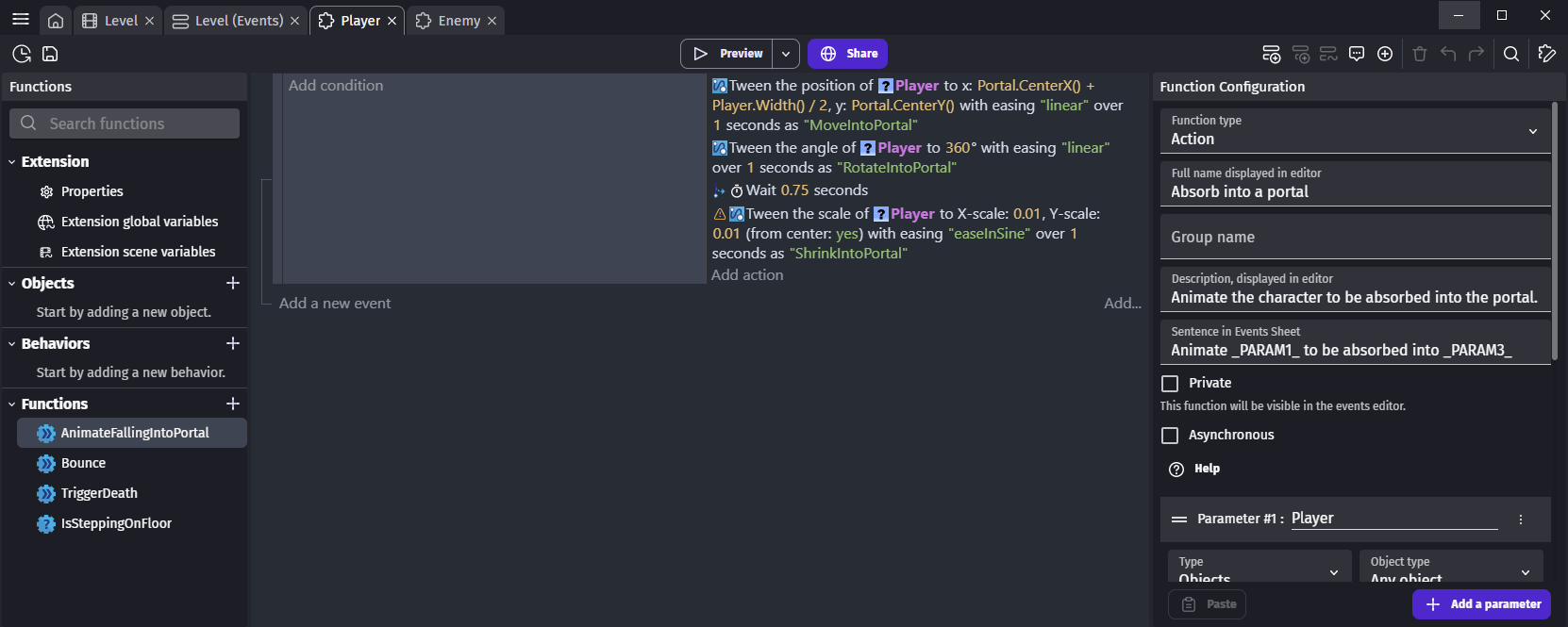 Similarly to scenes or external events, functions are written with events. They allow to create new conditions, new actions and new expressions that add up to GDevelop features. They are a good way to organize events, avoid duplication and share features with the community.